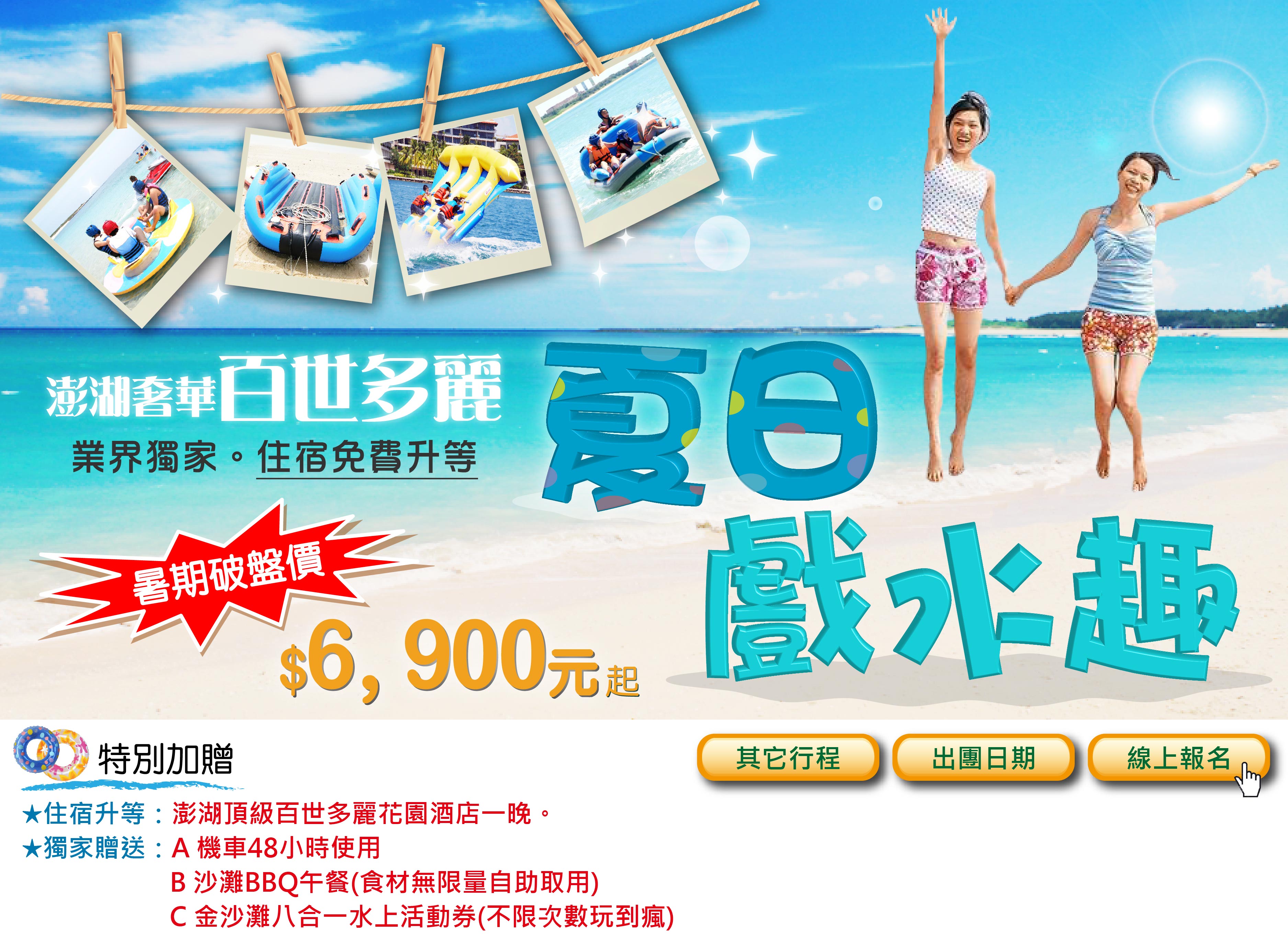 今日為您安排《金沙灘水上活動一日遊》 今夏最HOT的活動:水上摩托車、香蕉船、鴛鴦飛船、搖擺快艇、大力水手、飛毯衝浪、拖曳圈-無限暢玩!※若年紀較大或小孩無法玩水上活動者,可更改為海上娛樂船海釣、體驗螃蟹籠捕蟹、抓鰻管。